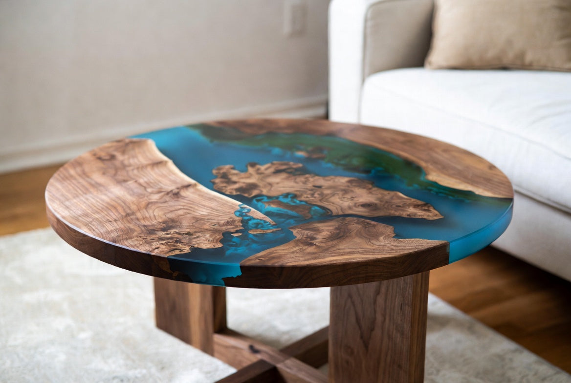 Personnalisez votre table en bois massif et résine époxy et obtenez un mobilier artisanal, unique et à votre image.